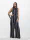 The Alicia V-Neck Jumpsuit is a show-stopper! Shiny metallic gunmetal woven poly flows from crisscrossing, adjustable elastic waist, to a plunging surplice bodice.