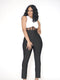 The Alicia V-Neck Jumpsuit is a show-stopper! Shiny metallic gunmetal woven poly flows from crisscrossing, adjustable elastic waist, to a plunging surplice bodice.