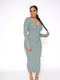 Long sleeve ribbed bodycon maxi dress. Featuring a prominent round neckline, front snap-button closure, and elegant side leg split. Not only does this bodycon have great stretch, but its luxurious fabric also sculpts the body giving you an elevated hourglass figure