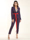Blue flower embroidered set comes in a sheer nude mesh fabric and includes a notch lapel blazer, double breasted with open pockets and decorative flap + cropped narrow leg pants.